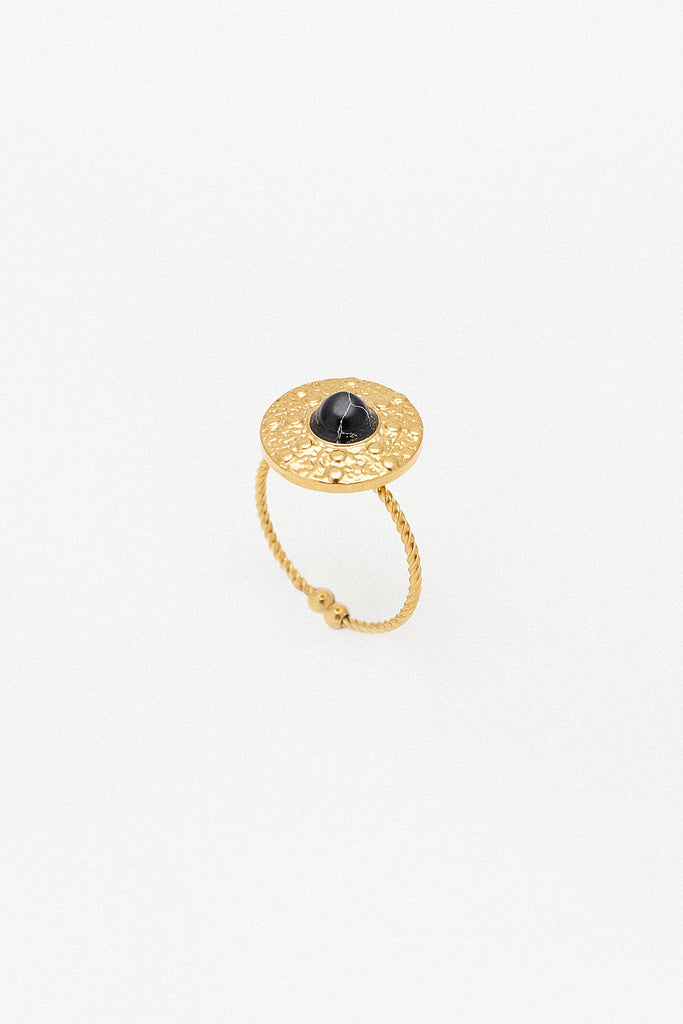 Anel ajustável com um ornamento em circulo e uma pedra preta superior. Combina bastante bem com outros acessórios. Ideal para uso diário.