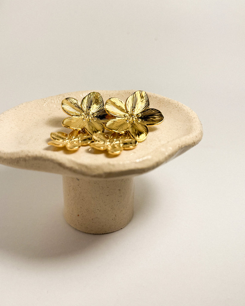 Brincos compridos compostos por duas flores. Dão vida a um look básico.