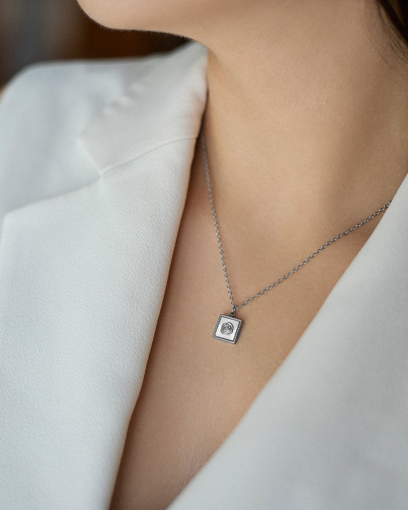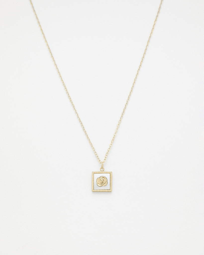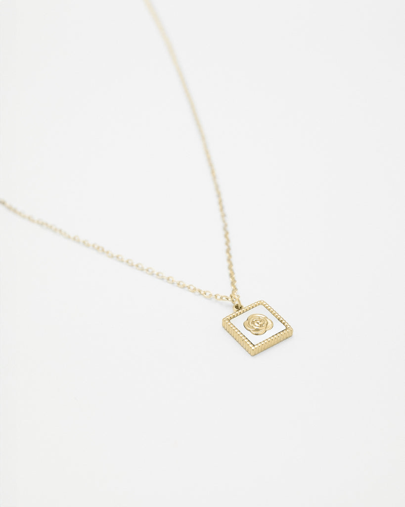 Colar de aço inox com malha simples e pendente quadrado. Pendente com fundo de madre pérola e desenho de uma pequena rosa. Colar simbólico e ideal para quem gosta de flores e peças com elementos figurativos.