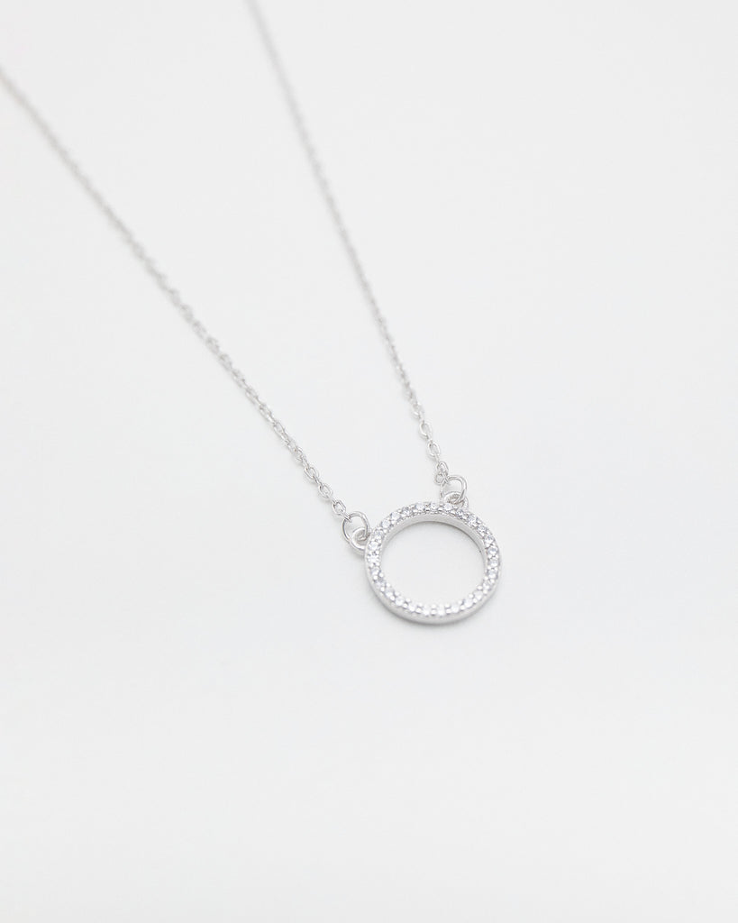 Colar de malha fina e pendente em circulo coberto de zircónias. É uma peça básica mas vistosa. Ideal para fãs de brilhos!