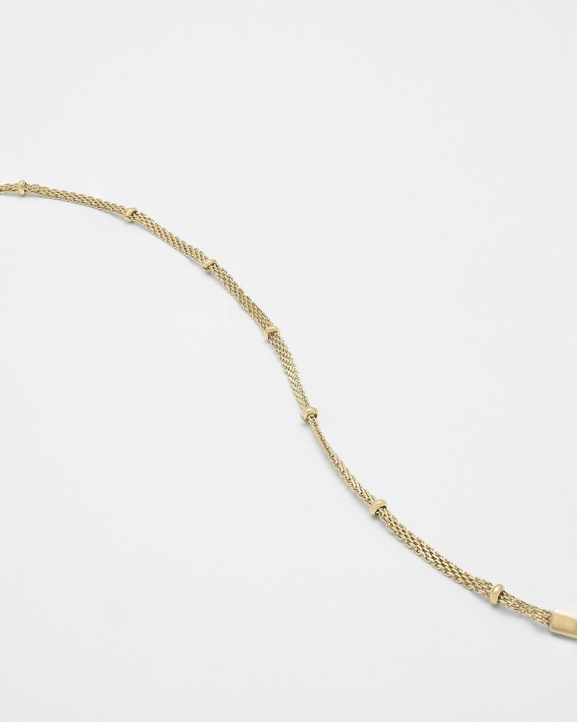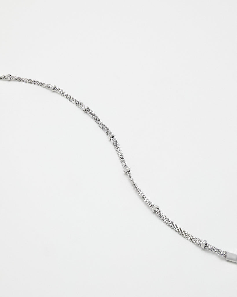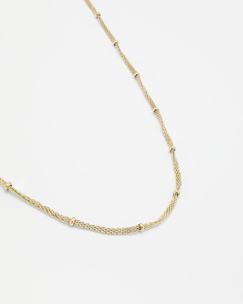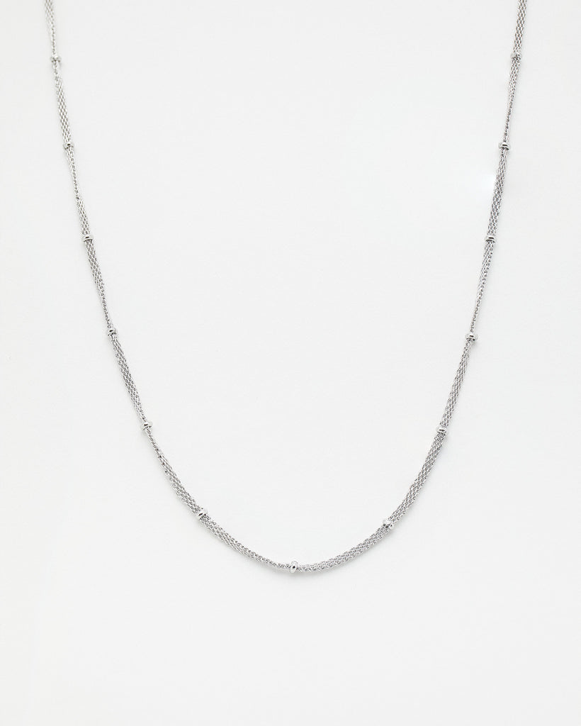 Colar de aço inox com malha fechada e pequenas esferas dispersas pelo seu comprimento. É uma peça bastante simples e que marca a diferença num conjunto simples. Conjuga com a pulseira conjunto.