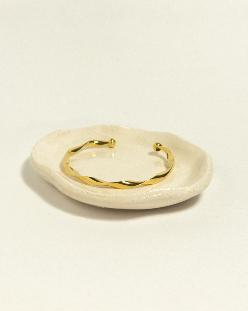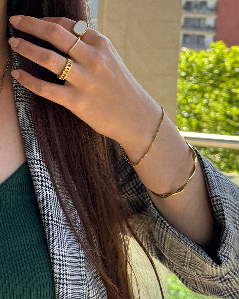 Pulseira torcida em aço inox. Ideal para uma festa ou para um look mais arranjado. Disponível apenas em dourado.